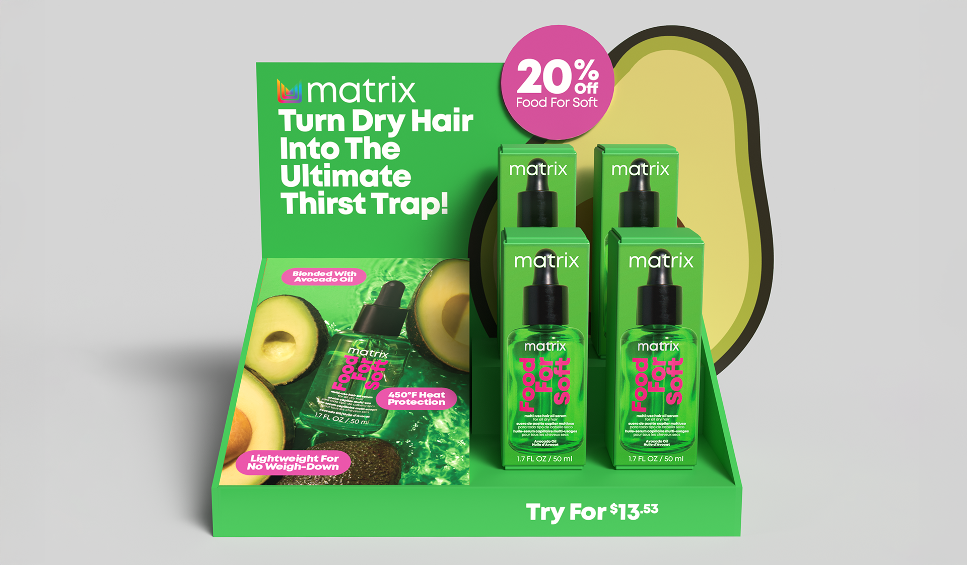 As part of the Professional Products Division DMI creative team, I have worked on the development of all Food For Soft store assets from the line's initial launch. As Matrix's current top hair care line, Food For Soft has featured placements in stores across the world, with notable moments in the US Ulta, BSG, and SalonCentric stores. To keep its presentation fresh from year to year, I worked closely with the marketing and printing teams to develop eye-catching, out-of-the-box solutions that stand out in stores and encourage customer interaction.